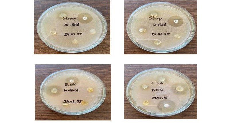 Figure: Antibacterial test (Disc diffusion method)-Observing zone of inhibition on gram negative bacteria (E.coli) and on gram positive bacteria (Streptococcus)