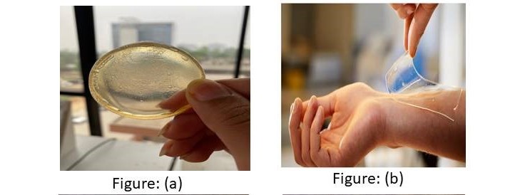 Figure: (a) Hydrogel Disc, (b) Hydrogel sheet (incorporated with garlic extract and ZnO NPs) being applied on wounded wrist