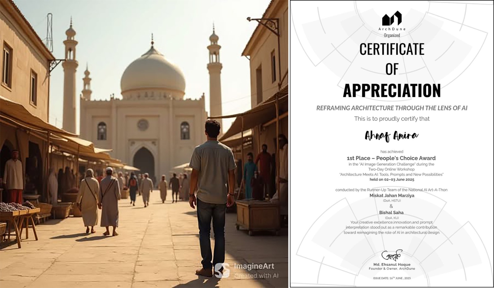 Ahnaf Amira Chowdhury (ARCH 08) received 1st Position in the People’s Choice category of the Architecture Meets AI online workshop competition for her concept titled “Transported to the Wrong Time of the Ottoman Era Ipsum”, organized by Archdune on 16 June 2025. Read More
