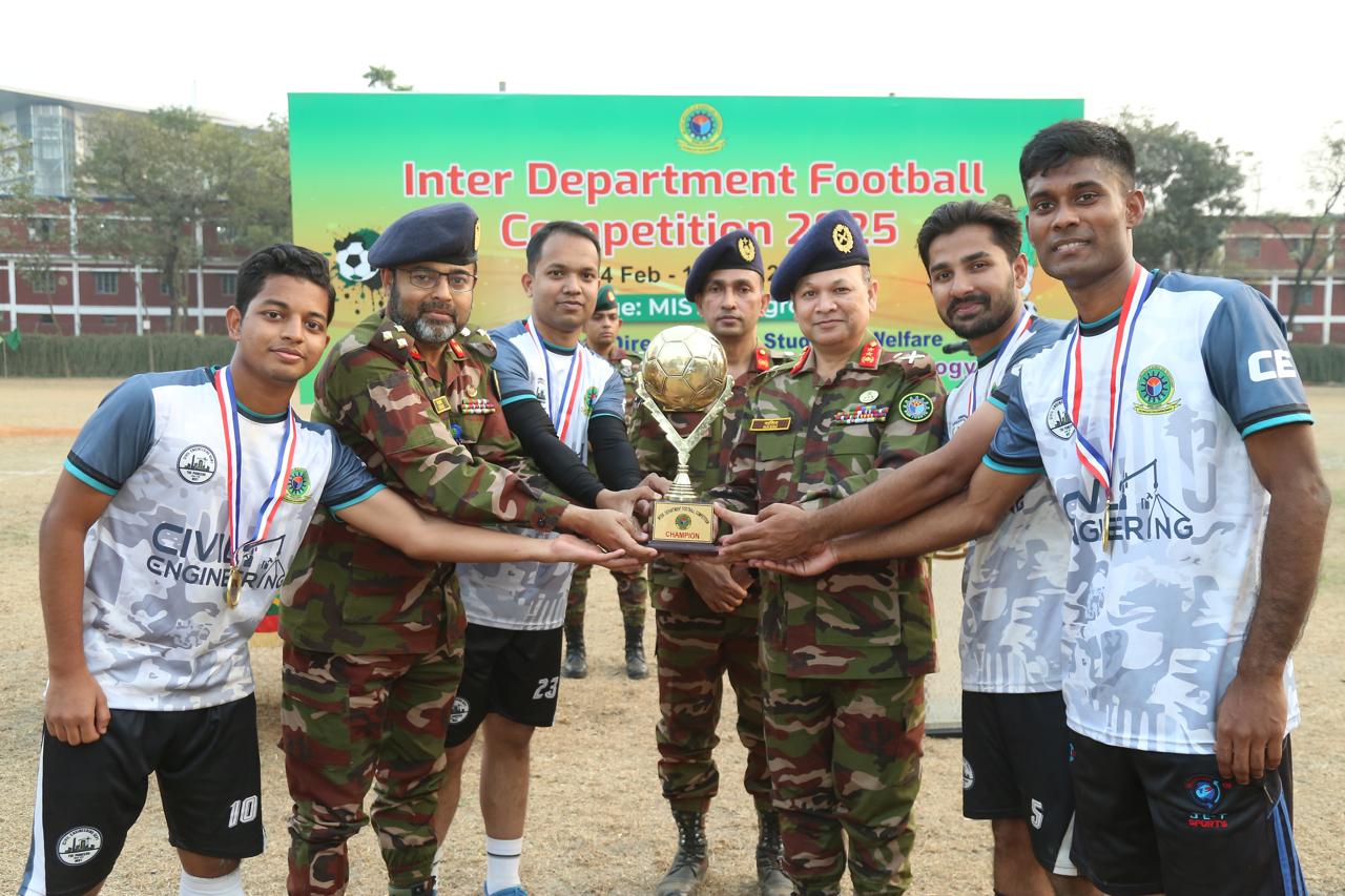 Department of Civil Engineering always inspires and supports for voluntary social philanthropic activities that fall outside the realm of the normal curriculum of university education. Diversity in clubs and extracurricular activities plays an important role in adolescent lives and futures. Our students promptly take part in cultural competitions, debate competitions, leadership development programs, etc and have certainly proved their capabilities in the above activities. CE dept was Champion in inter dept football competition in 2025. Our students have also proved themselves in the field of cultural competition as well. Our students also know how to have a little fun in spite of their academic involvement. They arrange CE fest yearly where different competitions like truss challenge, pervious concrete challenge, Cad contest, poster presentations, etc are organized successfully.
