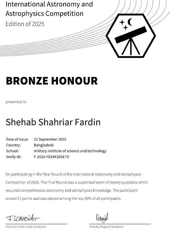 Shehab Shahriar Fardin of AE Dept, has been awarded the Bronze Honour in the International Astronomy and Astrophysics Competition (IAAC) 2025. Assistant Professor Nazifa Tasnim served as the official supervisor. This accomplishment highlights the continued success of MIST with IAAC, underscoring... Read More