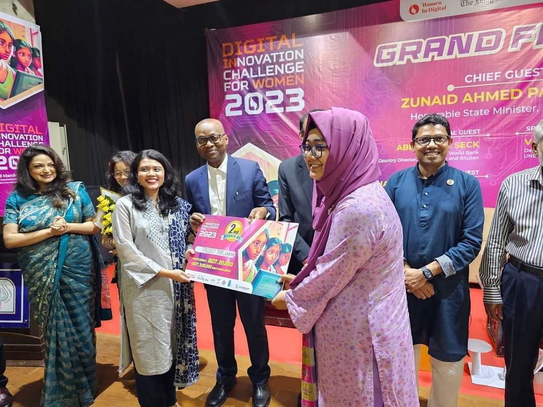 Team Grande, comprising participants Ellora Yasi and Maliha Zerin from Level 4, from the CSE Department, achieved an impressive feat as the 2nd Runner-up at the Digital Innovation Challenge for Women 2023. The inauguration ceremony, held on Tuesday, March 14, 2023, marked the beginning of the event, which aimed to inspire and empower women in digital technology. The contest reached its culmination with a prestigious award-giving ceremony on May 14, 2023. Team Grande's exceptional performance not only earned them well-deserved recognition but also a cash prize of BDT 20,000. Additionally, as part of their winnings, they will receive access to a product development facility and valuable support in safeguarding their ideas through copyright protection. The event was organized by Woman in Digital, a dedicated organization that was established in 2013 with the mission of nurturing a new generation of female leaders and entrepreneurs in the country.