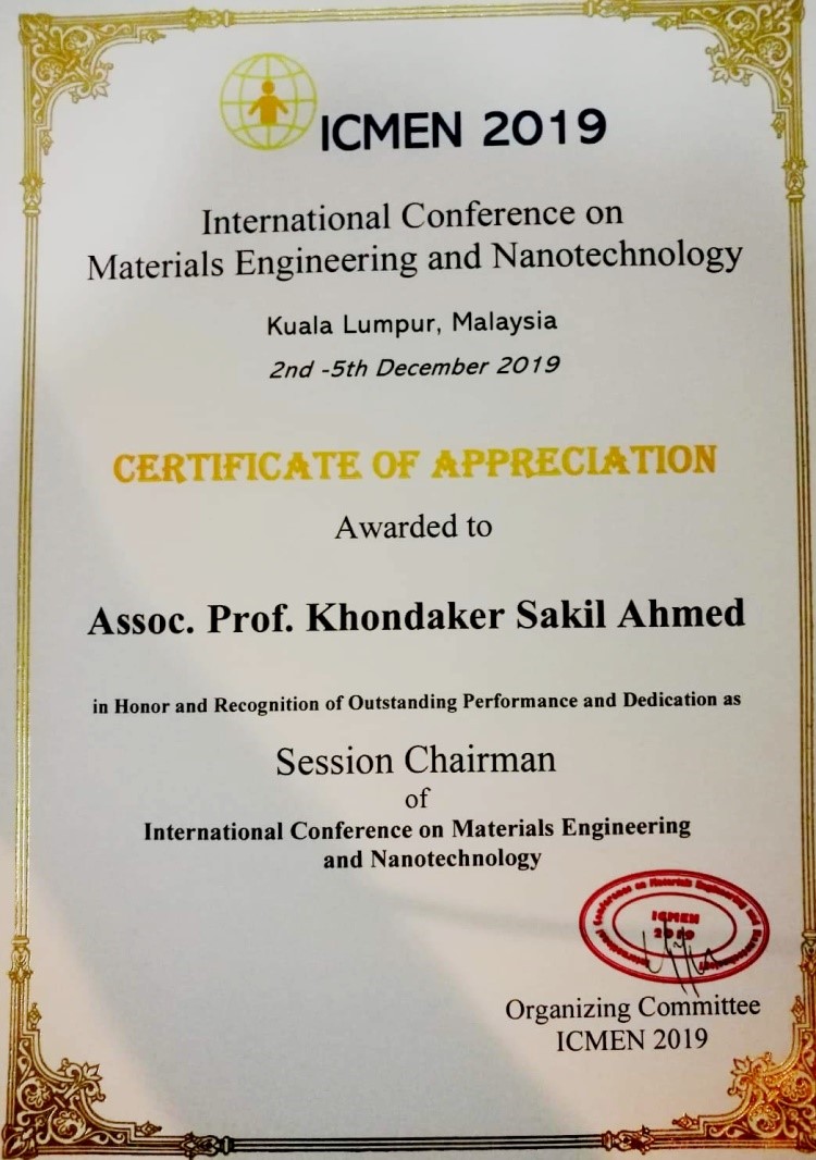 Assoc. Prof. Khondoker Sakil Ahmed was invited as session Chair at ‘ICMEN 2019’ international conference on “Materials Engineering and Nanotechnology” held in Kuala Lumpur, Malaysia 2nd to 5th December 2019. He also presented a paper titled “Wall thickness dependencies of carbon nanotube reinforced Nano composites” in the conference.
