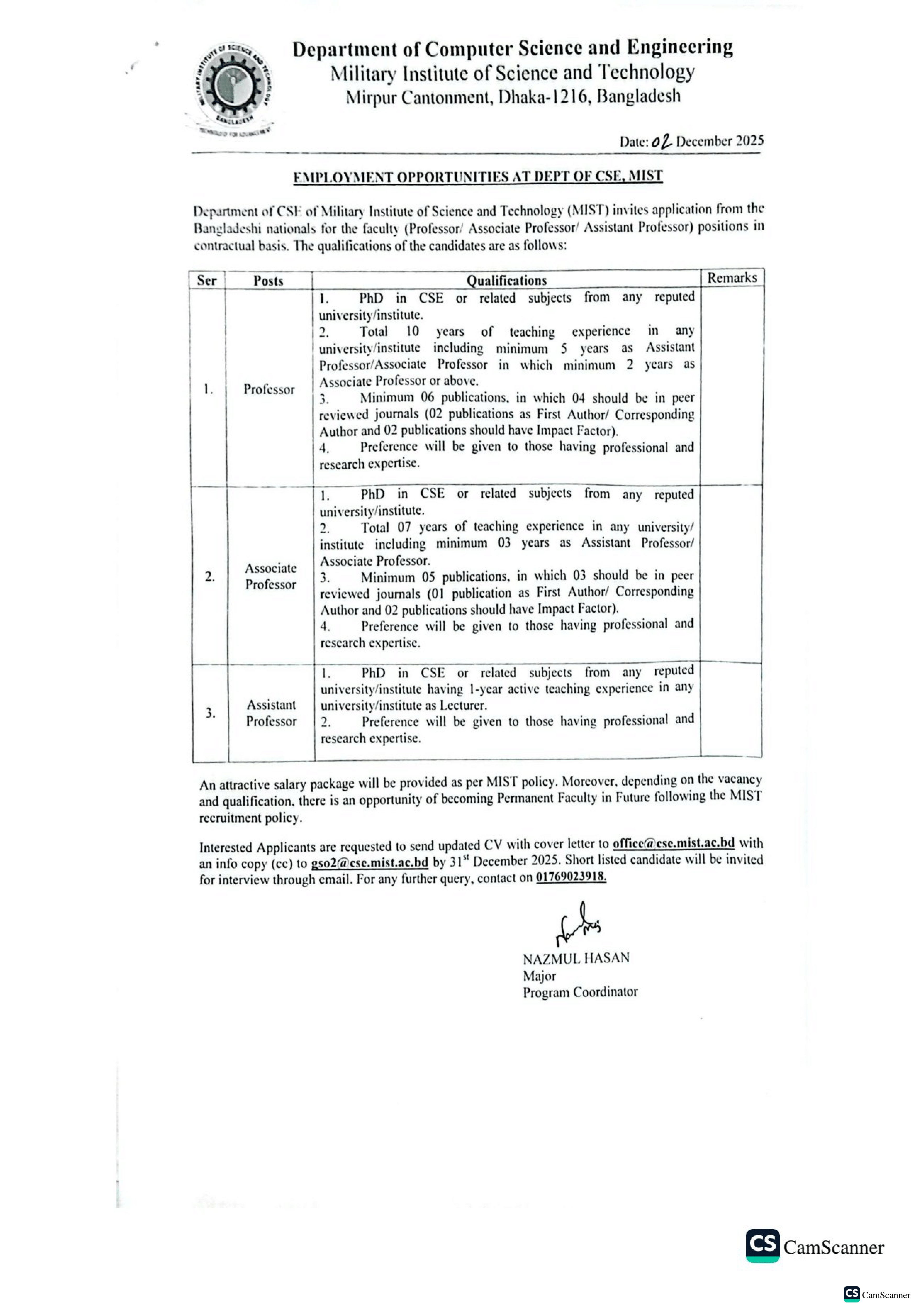 Email: head@cse.mist.ac.bd (Headof the Dept), gso2@mist.ac.bd (Program Coordinator)
