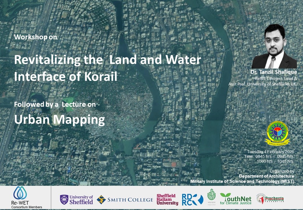 Read MoreWe are pleased to announce that a workshop on Revitalizing the Land and Water Interface of Korail will be held on February 4, 2025 at the Architecture Department, MIST . The workshop will be followed by a lecture on Urban Mapping. The keynote speaker will be Dr. Tanzil Shafique, ReWet Project...