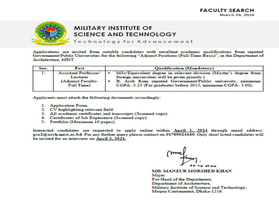 Read MoreEmployment Opportunity in the Department of Architecture, MIST